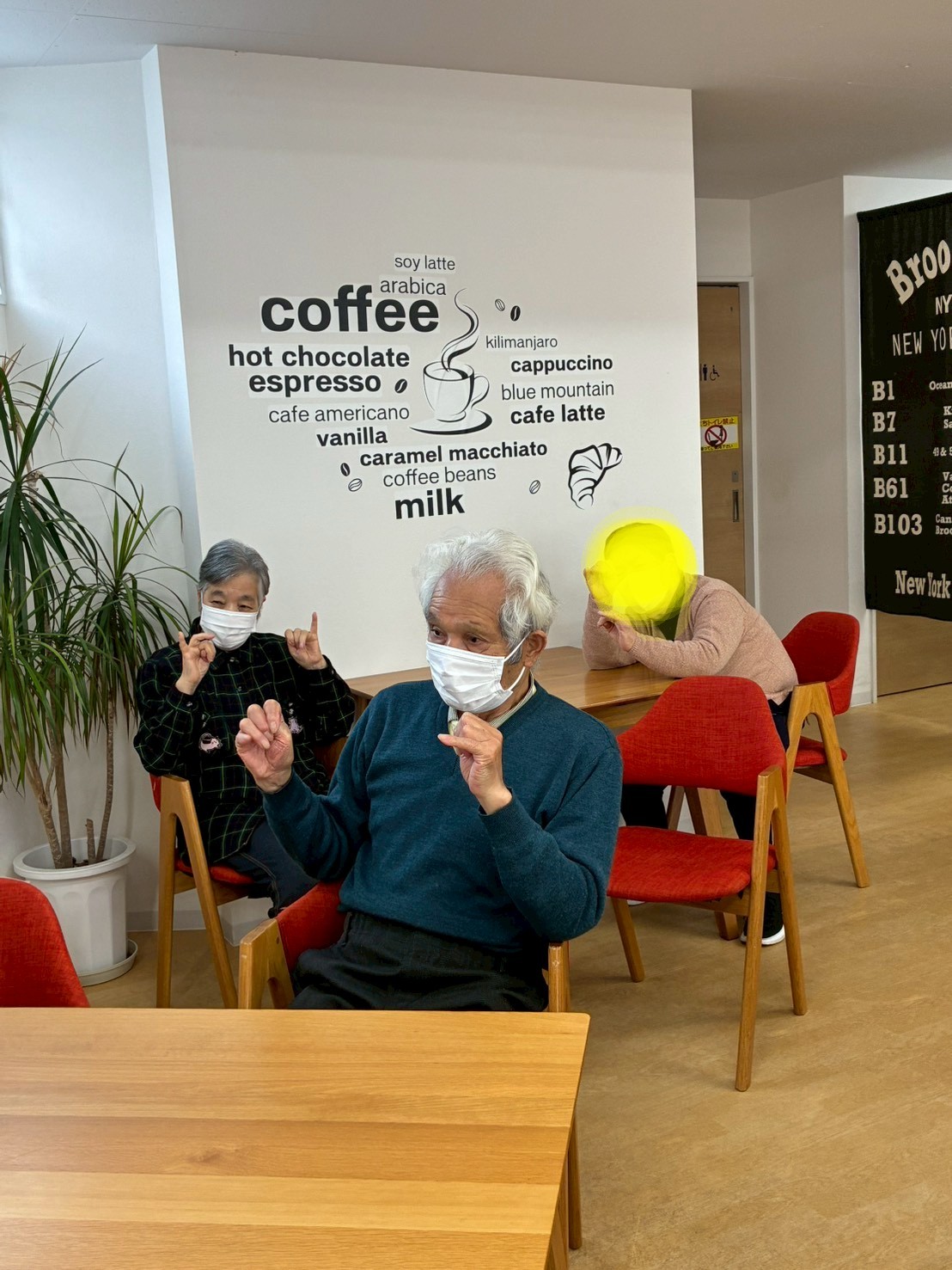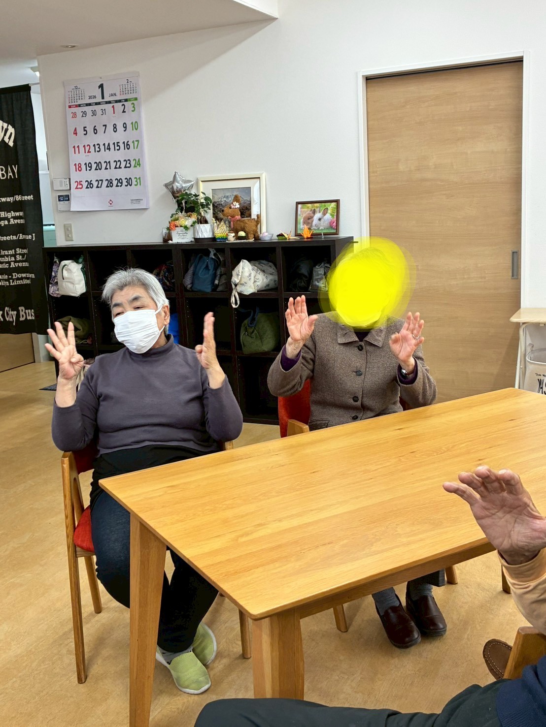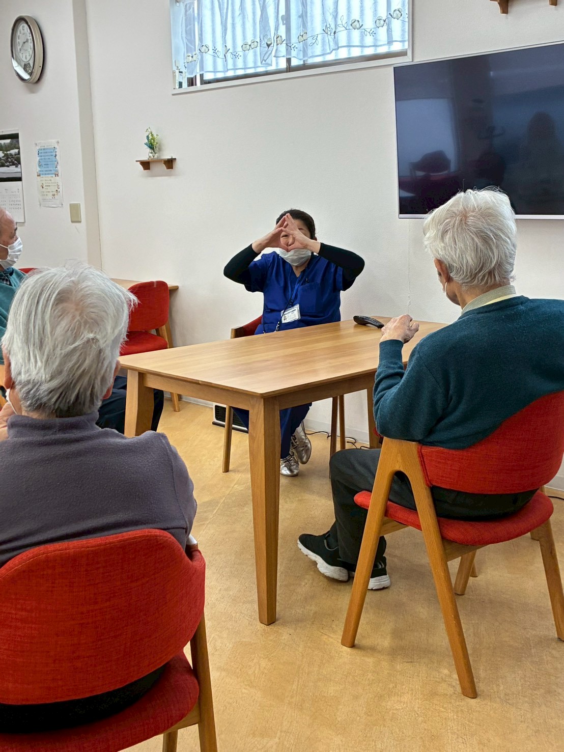 職員や顔なじみの利用者さんと、にぎやかに指体操に取り組まれていました♪